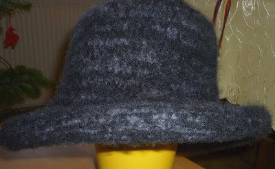 ... and here as a hat, felted ..... after a user of tens bestricknedes .... felted times, but still a little big ....